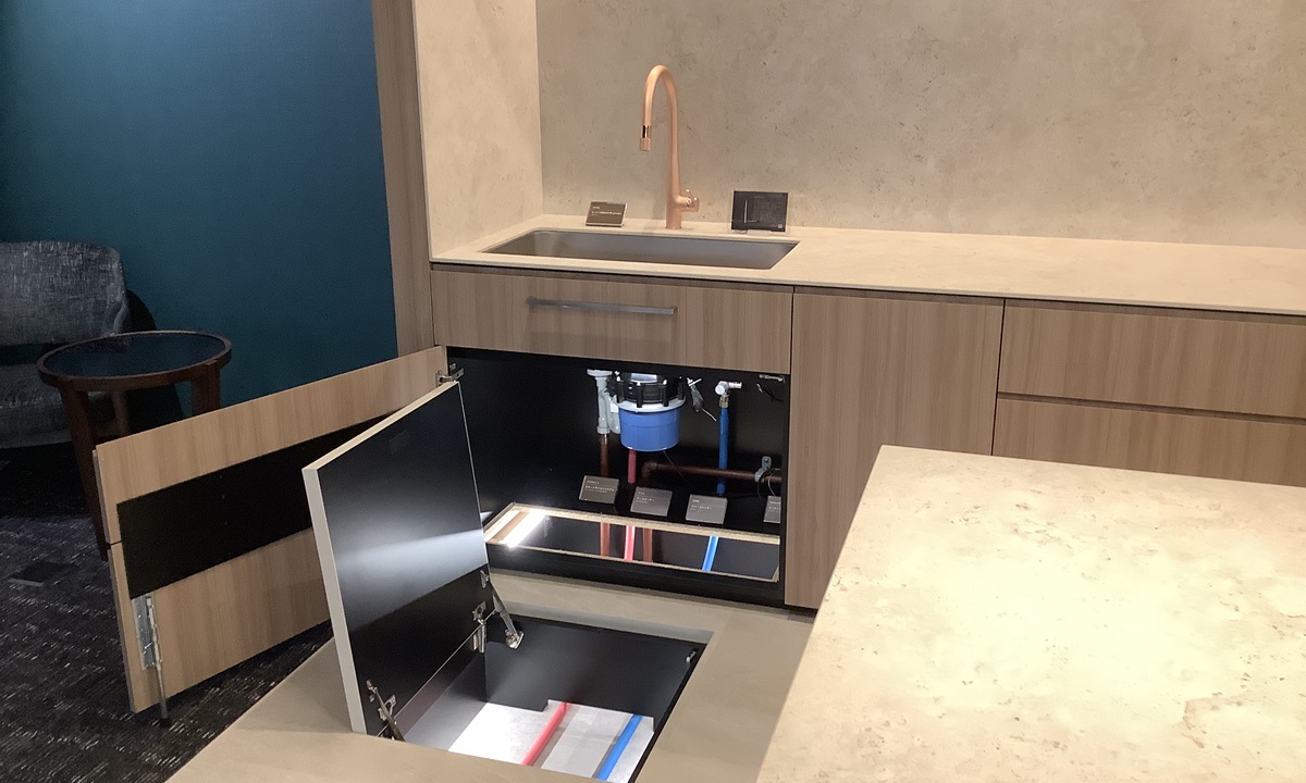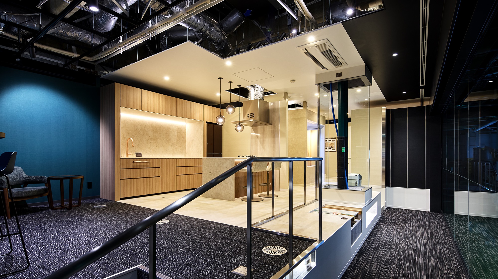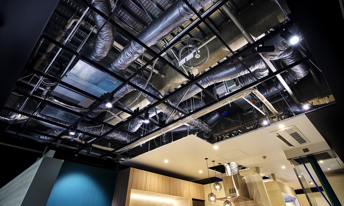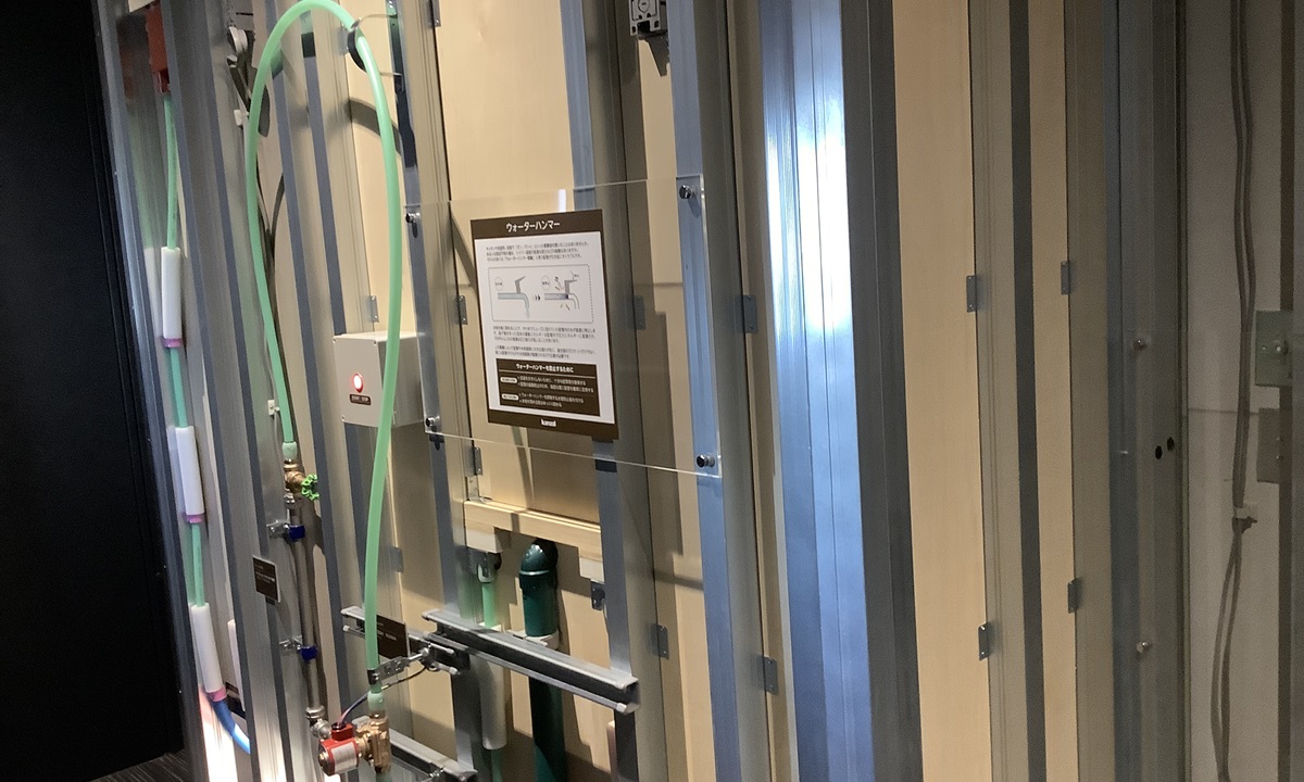Depotの3階には「kanzai Shinkiba SHOWROOM」を設置。集合住宅ゾーンではユニットバスやレストルームの機器・配管を、オフィスゾーンでは天井裏の空調機器や配管をわかりやすくご覧いただけます。ウォーターハンマー現象や、蛍光塗料入り接着剤の発光を体験できるゾーンもございます。